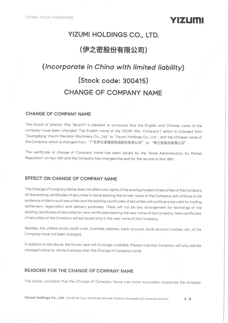 The board of director (the "Board") is pleased to announce that the English and Chinese name of the company have been changed. The English name of the YIZUMI (the "Company") which is changed from "Guangdong Yizumi Precision Machinery Co., Ltd." to "Yizumi Holdings Co., Ltd.", and the Chinese name of the Company which is changed from "廣東伊之密精密機(jī)械股份有限公司" to "伊之密股份有限公司".