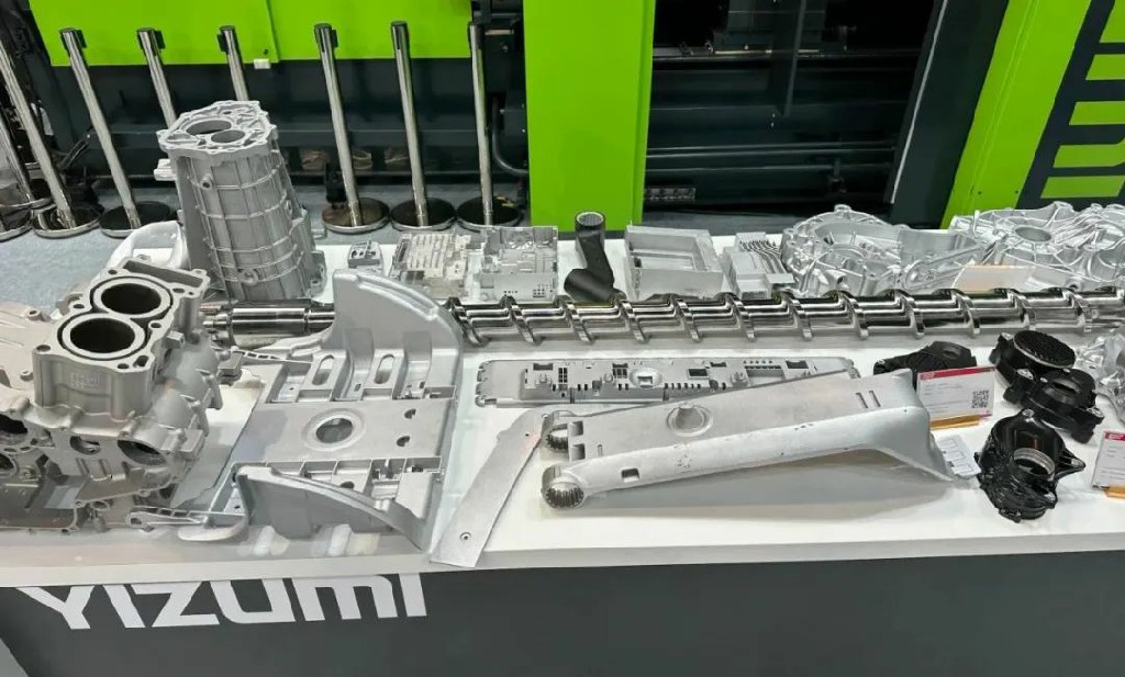 在伊之密展位上,擺放了款式多樣的金屬制品。其中,伊之密與國(guó)內(nèi)整車制造企業(yè)共同完成的“超大制品”一經(jīng)亮相就受到廣泛地關(guān)注。該產(chǎn)品的外形尺寸1875x1617x736 mm,是當(dāng)前已知最大的大型一體化壓鑄結(jié)構(gòu)件,澆注重量超過(guò)100公斤,而且平均壁厚只有3個(gè)毫米,對(duì)于壓鑄而言是一個(gè)巨大的挑戰(zhàn)。歸功于LEAP系列壓鑄機(jī)的超強(qiáng)動(dòng)態(tài)壓射性能,將最遠(yuǎn)充型距離超過(guò)2米的成型變得如此輕松,它鎖模力超過(guò)100000kN的LEAP9000T超大型壓鑄機(jī)壓射而成。